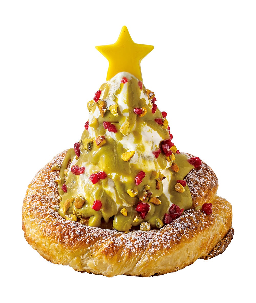 そして、サンマルクカフェでも昔から根強く人気のある、温かいバターデニッシュの上にソフトクリームを乗せたデザート『デニブラン』の季節デザートがついに登場。デニブランの上には、クリスマスツリーのような、濃厚なソフトクリームとピスタチオのとろっとしたクリームにピスタチオやラズベリーをトッピング。仕上げにはツリーのトップに大きな星のようなチョコレートをトッピング、クリスマスムードをより盛り上げてくれます。